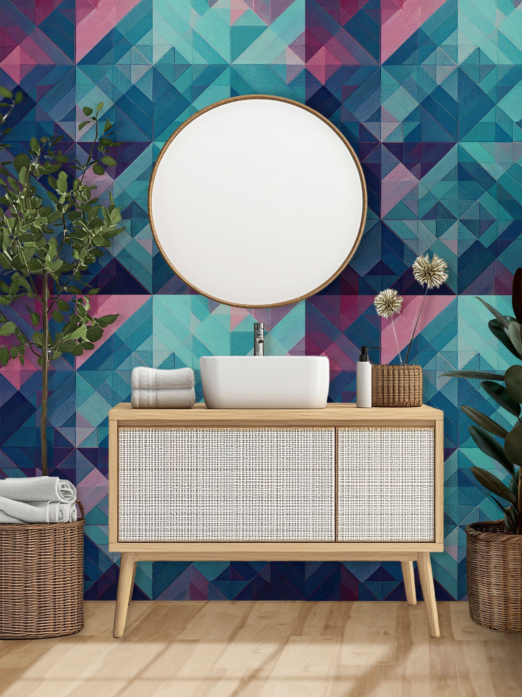 Twilight Geometry captures the shifting beauty of dusk in a structured, crystalline form. With cool teal, turquoise, indigo, and violet tones interlaced with magenta, this geometric pattern evokes the glow of twilight settling over water or city lights reflecting through glass. The triangular grids create a rhythm of order and flow, making this design versatile for both modern interiors and bold statement walls.